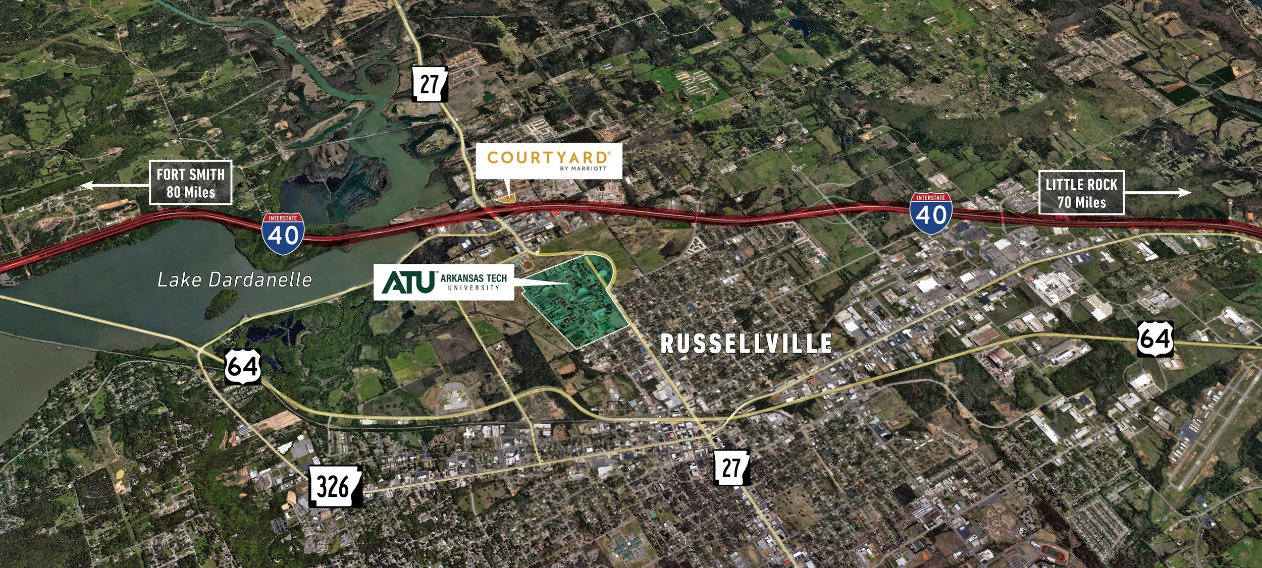 The Property lies along Interstate 40, the major highway running through Russellville, which carries over six million vehicles each year. This prime frontage gives the Hotel exceptional visibility and easy access to the greater Russellville area as well as the broader region. Strategically positioned roughly 70 miles west of Little Rock and 80 miles east of Fort Smith, Russellville benefits from access to both metropolitan markets, infrastructure, and logistical networks. I-40 connects the city directly east-west, enabling efficient movement of goods, services, and labor between regional hubs. This midpoint location makes Russellville particularly attractive for distribution, manufacturing, and other industries reliant on multi-market connectivity.